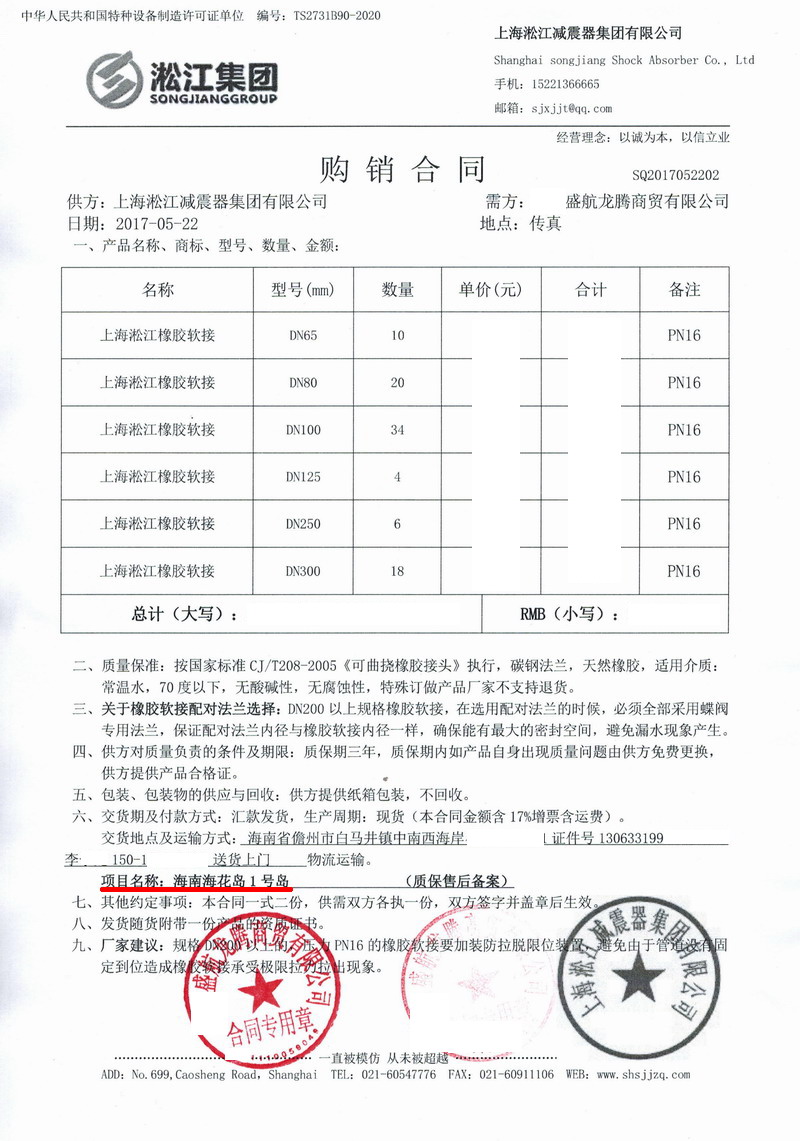 上海淞江減震器集團有限公司官方網站為您介紹:海南海花島1號島項目橡膠接頭合同信息,淞江集團為海南海花島1號島項目配套*批橡膠接頭產品,淞江集團為全*各大重點項目配套各種橡膠接頭產品。