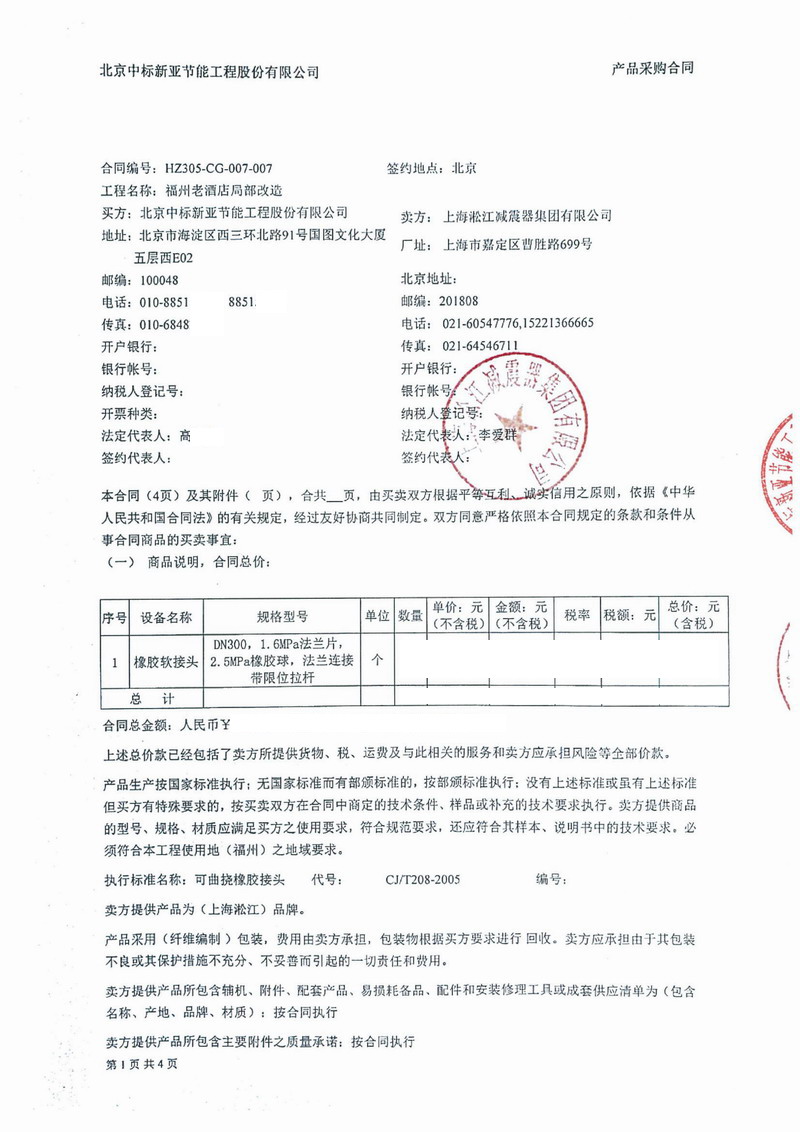 上海淞江減震器集團有限公司官方網站為您介紹:【福州世紀金源大飯店】局部改造用25kg橡膠接頭信息,淞江集團為各大星*酒店暖通、消防系統配套16kg橡膠接頭、25kg橡膠接頭產品,以下是為福州世紀金源大飯店局部改造項目配套25kg橡膠接頭合同掃描件。